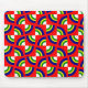 Esta almohadilla del ratón tiene un diseño Bauhaus de círculos de cuartos en azul, amarillo, verde y blanco sobre un campo de rojo.