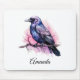 Mousepad con la imagen de un cuervo negro con alas rosadas violetas. Una mancha acuática rosa detrás de este bonito pájaro místico.