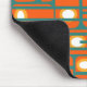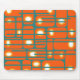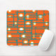 Esta almohadilla de ratón tiene un diseño moderno de mediados de siglo de rectángulos naranjas con círculos blancos y dorados en ellos y líneas horizontales verde azuladas que los atraviesan en un campo de verde azulado.