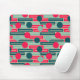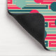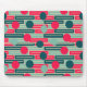 Esta almohadilla del ratón tiene un diseño moderno de mediados de siglo de repetición de rectángulos en rosa, verde azulado y azul con círculos sobre la parte superior.