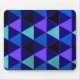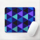 Diseño geométrico de Ron Trickett en color púrpura claro, azul claro, azul marino y verde claro. Patrón triangular