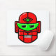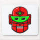 Cabeza de robot roja con un elegante panel de forma de media luna verde, un tercer ojo verde, con dientes blancos y resaltados. Tiene una especie de sonrisa extraña como si hubiera descubierto las maravillas de un nuevo aceite de motor revolucionario. De un dibujo vectorial original de N.A. Berry.