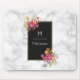 Un teclado del ratón con el nombre y la inicial del monograma. Marco negro con un delgado borde dorado. Ilustrado con ramos de flores en las esquinas. Las flores son rosas y naranjas, con estribos y hojas, elegantes y elegantes. El fondo es una foto de mármol blanco.