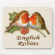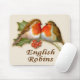 Dos rollos ingleses pelados sentados en una ramera Holly con bayas rojas. El texto dice Robins en inglés.