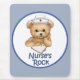 Enfermera de peluche con gorro de enfermera y notas en el portapapeles. El texto dice Rock de la enfermera.