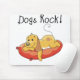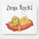 Un lindo perro marrón se relaja alegremente en su cama de cachorro y el texto negro dice "¡Roca de perros!" en nuestras camisetas de Roca de Perros, tazas, ratones, botones, tarjetas y más!