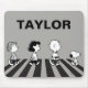 Esta obra de arte de Peanuts incluye a Snoopy tomando una siesta creada en un estilo de diseño de música rock.