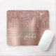 Almohadilla de ratón personalizado elegante y giratorio con purpurina de imitación de oro rosa goteando contra un fondo de Relieve metalizado metálico de imitación de oro rosa. Monograma con tu nombre en un elegante guión en blanco a la moda con toques.