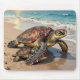 Coastal themed mouse pad with an illustration of a mama sea turtle and baby crawling into the blue ocean waves on a sandy beach.