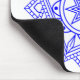 Este teclado del ratón tiene otro sencillo diseño de mandala hecho de líneas, curvas y formas en azul sobre un campo de blanco.