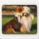 Y perro pastor de Shetland adorable que lleva un gorra del sol con un girasol en él.