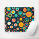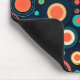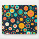 Un patrón vibrante y lúdico compuesto de círculos superpuestos en varios tamaños y colores. Los círculos están dispuestos de manera aparentemente aleatoria pero armoniosa, creando una composición dinámica e interesante visualmente. La paleta de colores está compuesta por tonos naranjas, azules, amarillos y rojos, colocados sobre un fondo oscuro. El conjunto es dinámico y alegre.