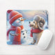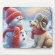 Un muñeco de nieve alegre y un adorable cachorro, ambos vestidos con un atuendo cálido de invierno, comparten un momento nevado bajo un cielo de color pastel