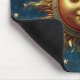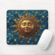 En medio de un fondo celeste estrellado, la cara serena de un sol dorado estilizado.