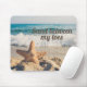 Personalized mousepad with the photo of a starfish on a sandy beach with ocean waves rolling in. Customizable text says, "Sand between my toes." Perfect for the beach lover, or someone who just wants to get away.