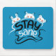 Este diseño presenta tres criaturas animales extrañas con ojos naranjas: conejo, oso y hámster. El fondo es azul verde azulado, lo que crea un marcado contraste con las letras de las manos blancas de las palabras "Stay Sane". La inscripción se realiza en una letra estilizada y cursiva que añade un toque de elegancia y refinamiento al diseño general. La frase "Manténganse sanos" aparece de manera prominente, lo que sugiere un mensaje de perseverancia y determinación frente a la adversidad.