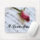 Un solo brote del rosa rojo pone a través de una hoja de la música en una fotografía original suave, soñadora, romántica del color. Este mousepad hace un gran regalo para el amante de la música. Muestran "aquí me amo texto de la música". Cambie fácilmente el texto y/o añada un nombre para personalizar.