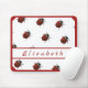 El diseño de Ladybug With Name Mouse Pad presenta un lindo patrón de mariposa contra un fondo blanco. El nombre/texto se muestra por delante en un color rojo/borgoñoso. El diseño está bordeado por una frontera roja/borgoña.