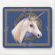 Cabeza blanca y encantadora de unicornio enmarcada con un círculo de nudos celtas y sobre fondo de denim azul.