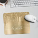 Almohadilla de ratón personalizado elegante y giratorio con purpurina de imitación dorada goteando sobre un fondo de Relieve metalizado metálico de imitación dorada. Monograma con tu nombre en un elegante guión en blanco a la moda con toques.