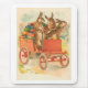 Bunnies de Pascua entregando huevos en un coche rojo. Tarjeta de felicitación victoriana de época.