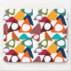 Esta almohadilla de ratón tiene un diseño moderno de mediados de siglo de triángulos dispersos, algunos con agujeros, en colores retro.