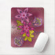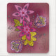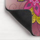Inspirado por los modelos del mehndi de la alheña, este cojín de ratón del diseño floral hace una obra de arte hermosa y funcional para el hogar o la oficina. Los colores magentas, violetas, rojos y marrón adornan estos tulipanes y narcisos estilizados, acentuados por las sombras frescas del verde.