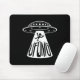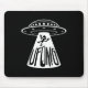 Ilustracion personalizado vectorial de un OVNI secuestrando a una persona que piensa que los extraterrestres rompen con el texto de la UFOMG. Etiquetas: OVNI, OMG, no identificado, volando, objeto, oh, Dios mío, espacio, nave espacial, alien, marciano, personalizado, diablo, cuernos, secuestro, cuarto, tipo, humor, platillo