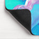 Un unicornio blanco hermoso con la melena rosada violeta, prancing contra un brillante con todo suavemente mirando el fondo azul de la aguamarina, con diez estrellas de plata alrededor de su cara. Su cuerno es azul profundamente ultramarino. Una pintura de acrílico del origina del artista Angela Flemming.