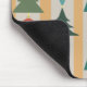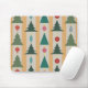 Esta almohadilla de ratón tiene un diseño moderno de mediados de siglo de árboles y adornos navideños colgados en una guirnalda con un fondo dorado y plateado.