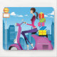 Vista lateral de la mujer con los regalos en la vespa. Copyright: Eastnine Inc.