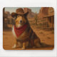 This mousepad features a cowboy sheltie in a western cartoon setting