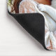 A pretty mouse pad with an illustration of a woman holding a white fluffy cat surrounded by dandelions, The picture has a crochet style fabric look.