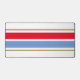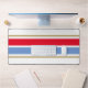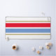 Esta moda, de diseño deportivo, presenta un fondo blanco con rayas horizontales del centro, de color rojo intenso y azul claro, adosadas con piñones marrones cálidos.