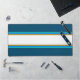 Las pinstripes azules y aquagües destacan una franja central horizontal blanca. Las amplias franjas de color azul oscuro del océano oscuro sobre y por debajo completan la composición deportiva.