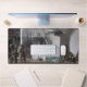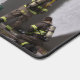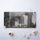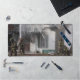 Una alfombra de escritorio con una foto de bomberos luchando contra el fuego de una casa.