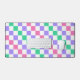 A vibrant checkerboard pattern featuring alternating pastel purple, pink, and green squares against a white background, creating a playful, colorful effect.