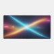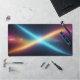 Completely transform your daily workspace or intense gaming setup into a modern command center with this breathtaking abstract cosmic desk mat. This massive horizontal canvas flawlessly showcases a spectacular collision of energy in deep space. Dynamic, glowing diagonal beams of bright cyan and warm golden-orange intersect perfectly in the center, creating a brilliant starburst against a deep, starry night sky.
