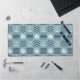 Un tejido inspirado en las plazas turquesas tormentosas, adornado con un velero y un ancla blancos, y cuadrados azul marino profundos, acentuados por cantos y olas azul claro, se acentúa con puntas blancas para crear un ambiente náutico clásico.