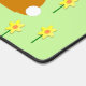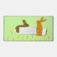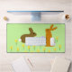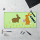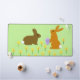 Esta impresionante alfombra de escritorio cuenta con un par de lindos conejitos de Pascua rodeados de flores de daffodil amarillas. Los conejos son marrones con orejas grandes, ojos negros y colas blanquecinas. Uno de los conejillos sostiene un huevo de Pascua con un arco violeta de bonito y se acerca para ofrecerlo al otro conejito. Los folletos son amarillos y tienen un centro naranja luminoso.