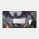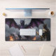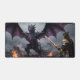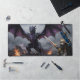 A large, dark purple dragon with massive wings faces a warrior in golden armor, who is holding a sword. The dragon is detailed with spikes and a menacing expression. The warrior is seen from the back, ready to fight. The ground is rocky and fiery, suggesting a volcanic or hellish landscape. The sky is overcast, adding to the dramatic atmosphere of the scene.