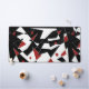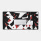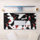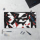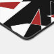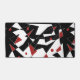 Varias formas geométricas de color blanco y rojo se reparten en un fondo negro, creando un contraste marcado. Algunas formas están interconectadas con líneas blancas finas y los puntos rojos agregan un toque de color a la composición.