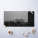 Fotografía en blanco y negro del Monte Rainier. En primer plano hay hileras de árboles, y en la base de Rainier hay colinas. El volcán cubierto de nieve tiene una gran nube de formas interesantes detrás. Para algunos parece una representación antigua de un barco espacial, para otros es una forma humana. ¿Cómo se ve la nube para ti? Derechos reservados ©2023 Kimberly J Tilley. zazzle.com/store/developingnature
