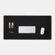 La elegante alfombra negra del escritorio cuenta con un monograma botánico dorado en el centro.