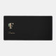 La elegante alfombra negra del escritorio cuenta con un monograma botánico dorado en el centro.