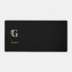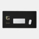 La elegante alfombra negra del escritorio cuenta con un monograma botánico dorado en el centro.
