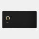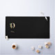 La elegante alfombra negra del escritorio cuenta con un monograma botánico dorado en el centro.