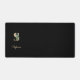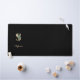 La elegante alfombra negra del escritorio cuenta con un monograma botánico dorado en el centro.