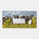 Esta colorida alfombra de escritorio cuenta con una hilera de vacas lecheras Holstein en blanco y negro que se encuentran detrás de una valla de alambre de púas con malezas amarillas en primer plano y un turbulento cielo azul-gris sobre el suelo.