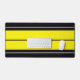 Este diseño fresco y deportivo presenta una franja vertical vívida de carreras de centro dividido en amarillo con pinstripes flotantes blancas adyacentes contra un fondo negro negrita.